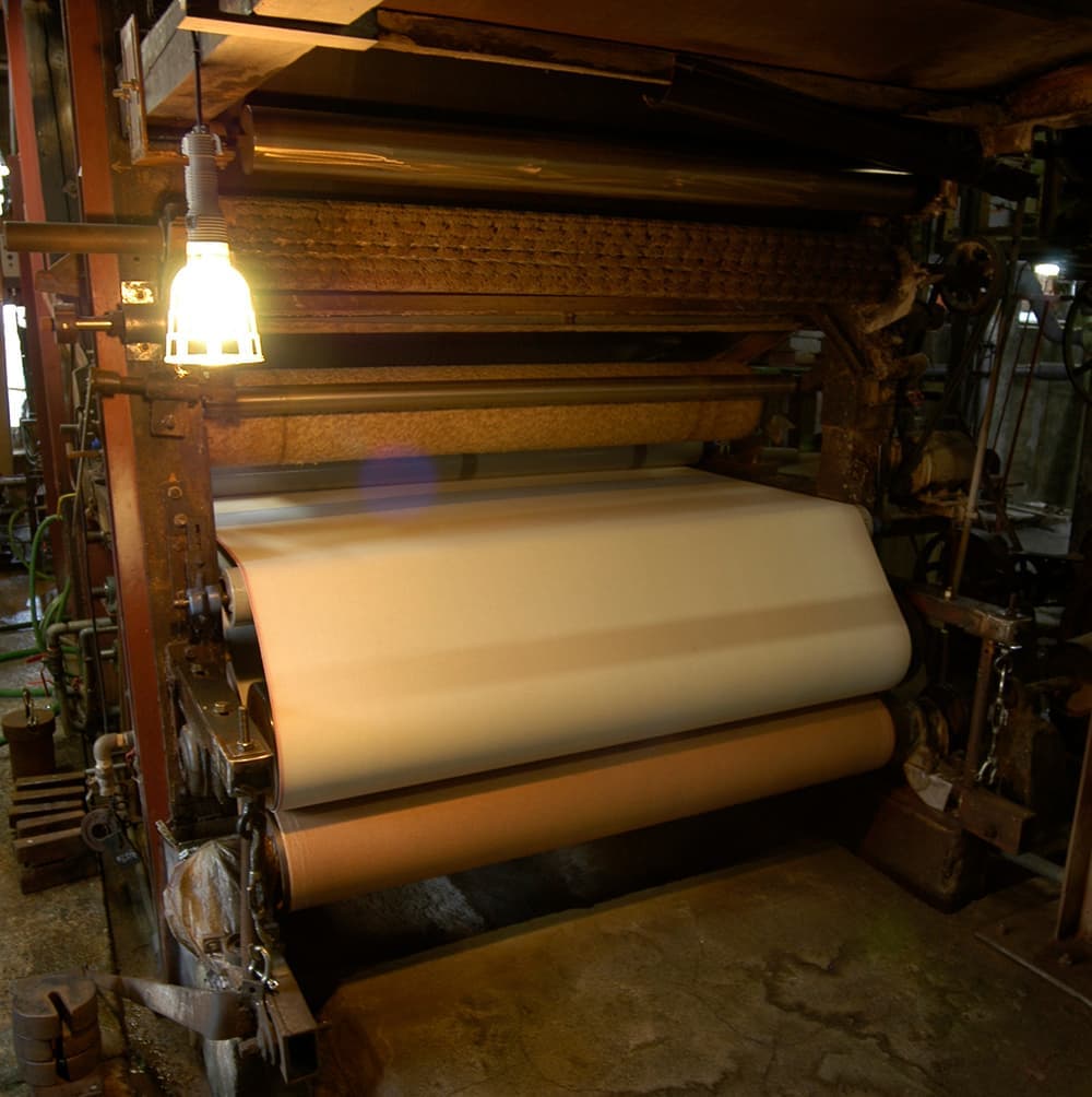 ソフトナオロンの原料は木材パルプとポリオレフィン繊維。この素材を和紙の手法で漉き、高温で乾燥させ、パルプとポリオレフィンの接合を密にして、紙自体の強度を高めてあります。