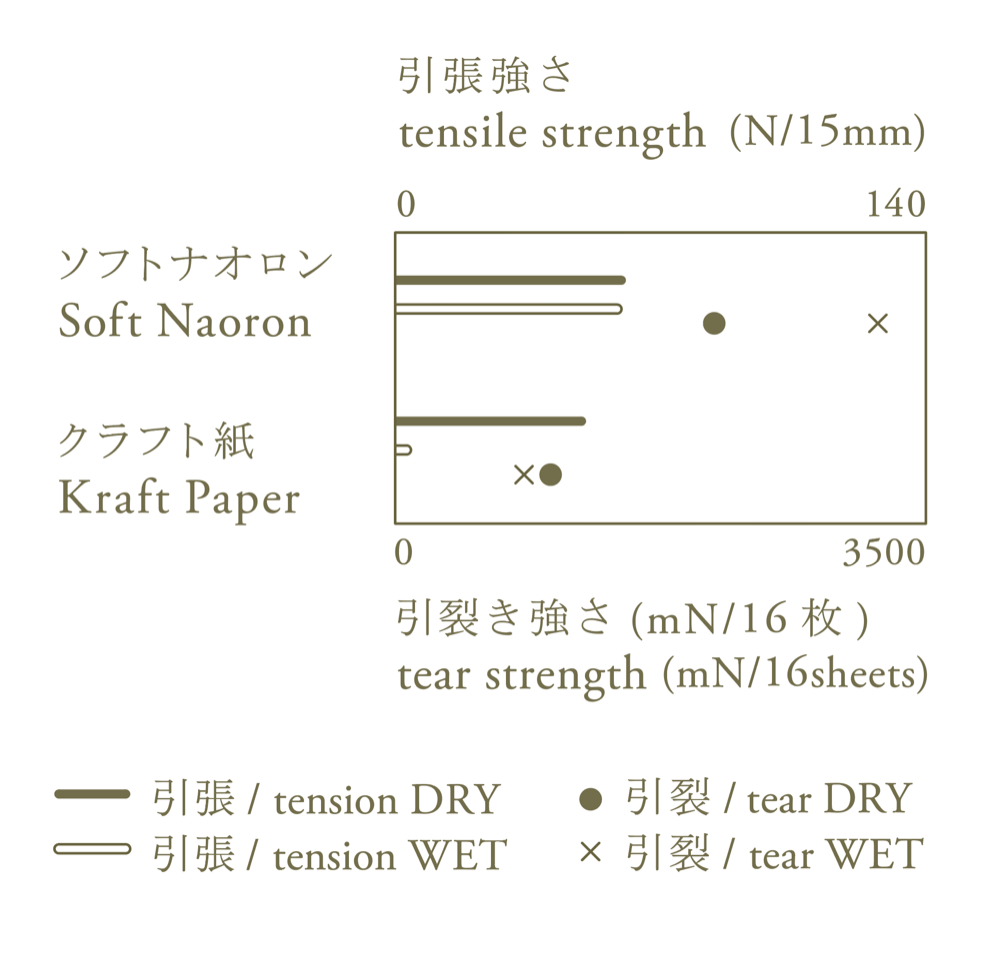 グラフは、一般的な紙袋に使われているクラフト紙と、ソフトナオロンの強さを比較したもの。みなさんよくご存じのように、一般的な紙は水に濡れるとたいへん弱く、簡単に裂けてしまいます。クラフト紙では実際、引っ張りにおいても引き裂きにおいても水に濡れた場合(WET)は弱くなってしまったことがグラフにあらわれています。