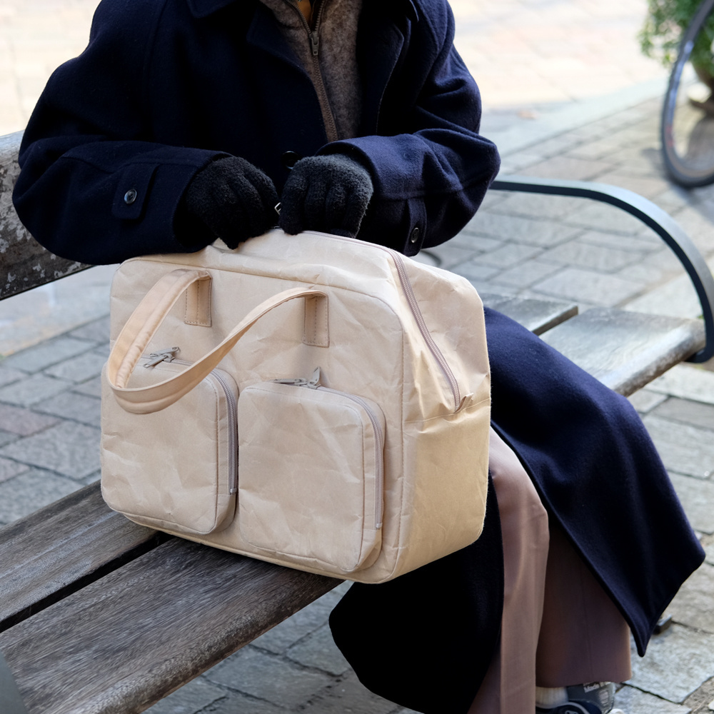 開口部のジッパーは本体の横まで広く開くことができますから、モノの出し入れもラクにしました。さらにハンドルは横幅3センチ。荷物が重くなったときは肩掛けが可能。布巻きにして握りやすく、本体にしっかり固定しました。