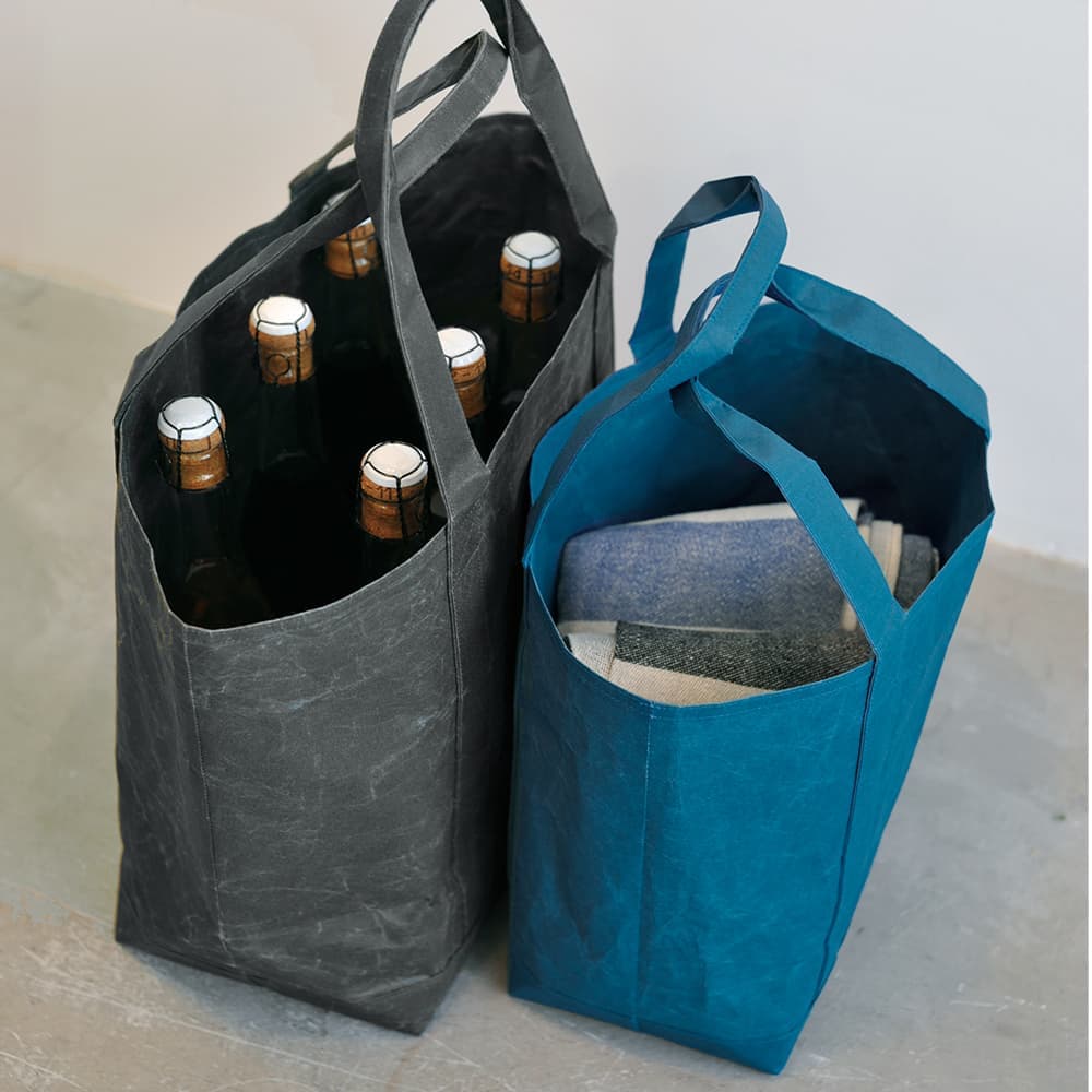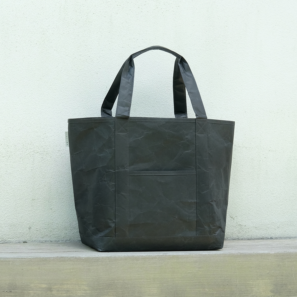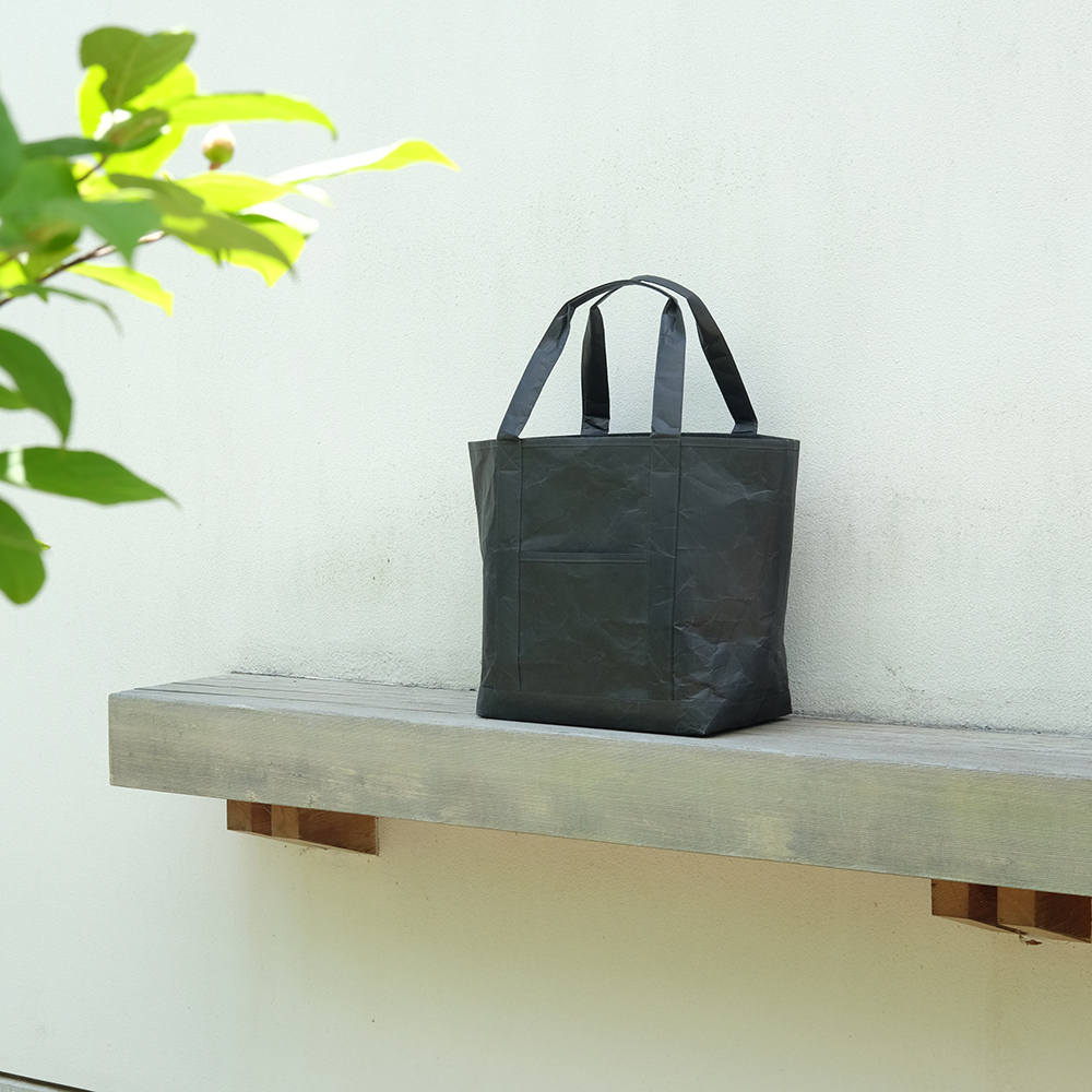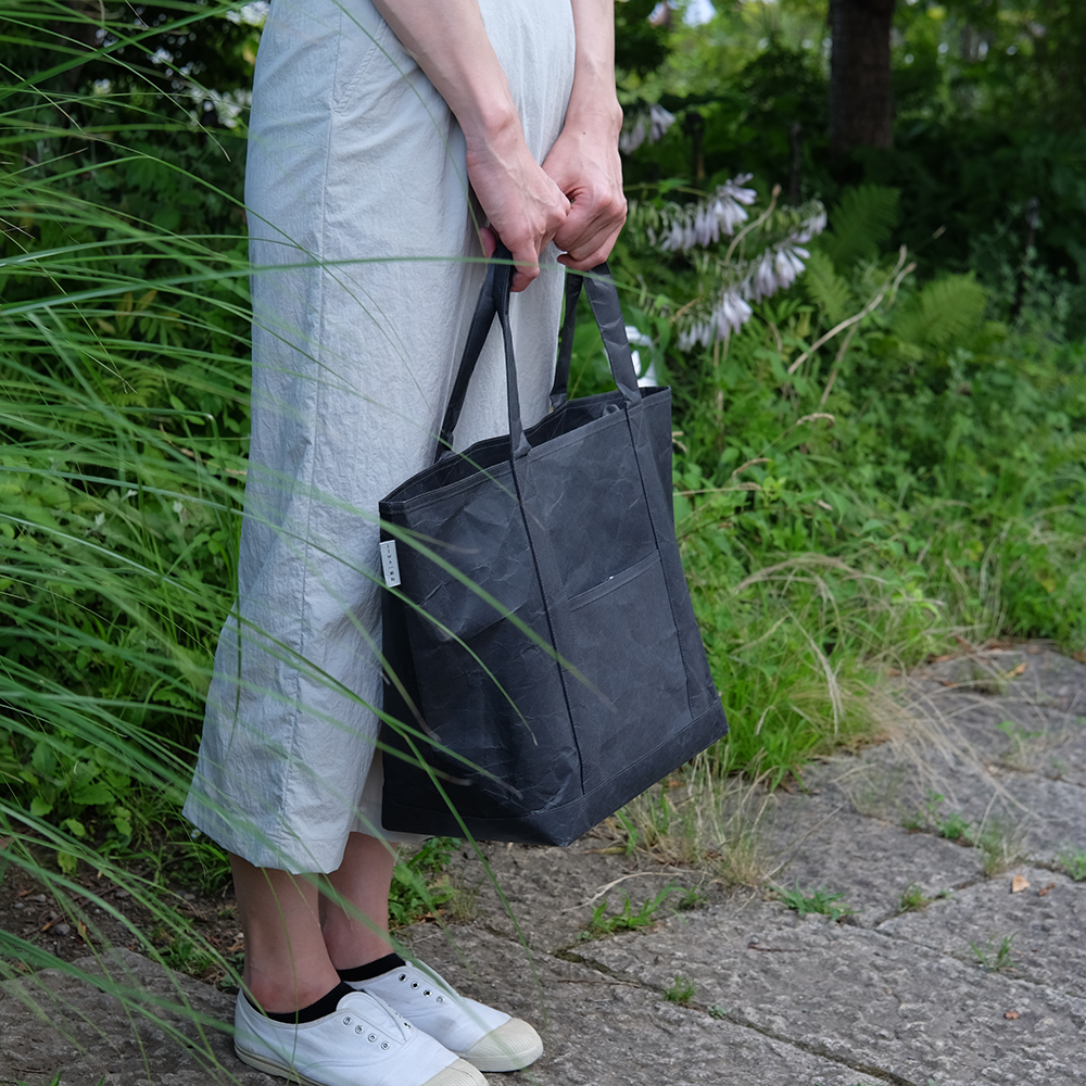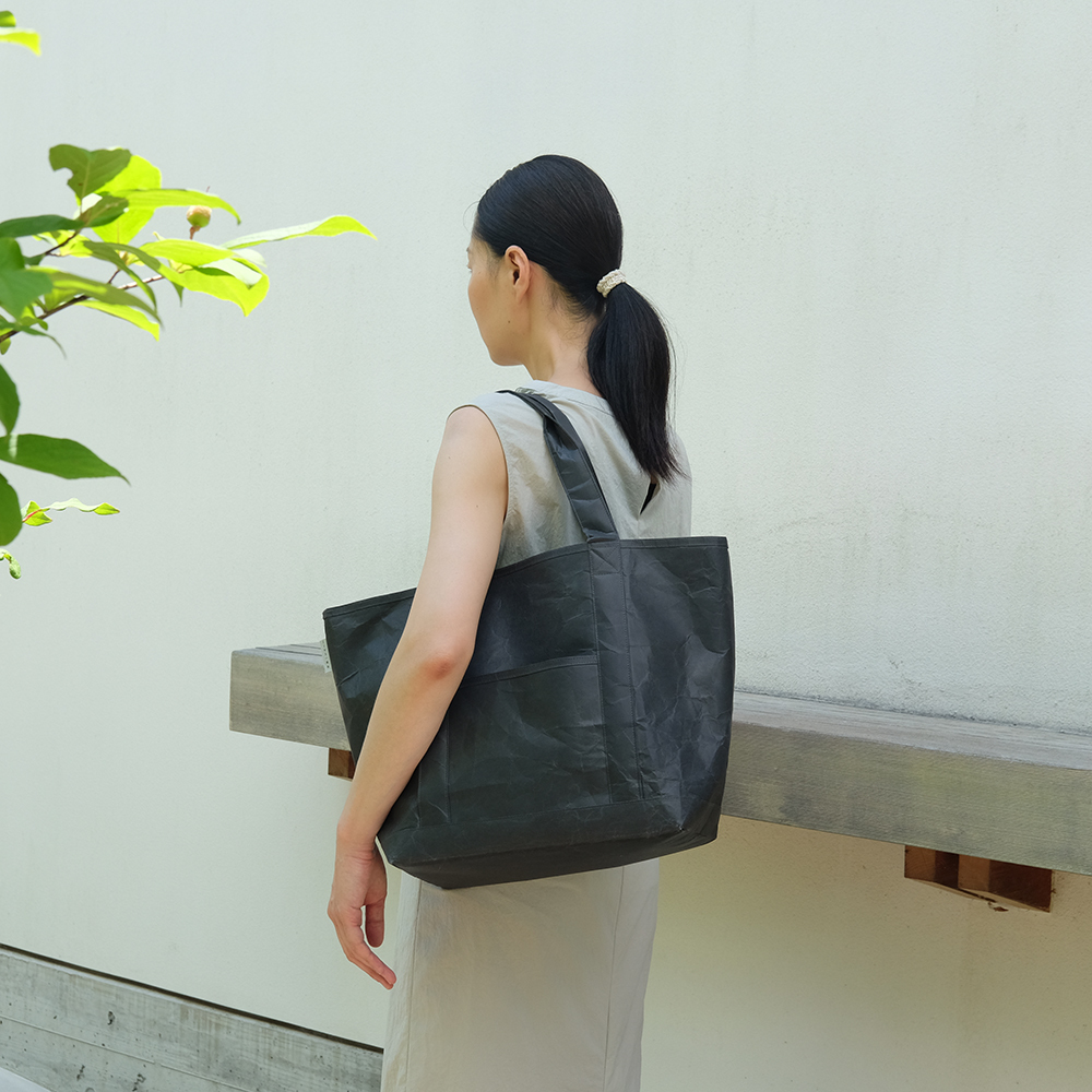 Large-capacity tote bags for personal belongings as well as for outdoor activities and sports are made from a new Japanese paper, hard naoron.The easy-to-hold handle can be slung over the shoulder even when the baggage is heavy. To ensure solid durability, these handles are extended from the bottom section and sewn neatly onto the body. The wide bottom section is 18 cm wide. The opening is a large 32 cm. The bag's opening is piped for extra durability. The pocket for a wallet or smartphone can also be used as an inside pocket by turning the body of the bag upside down.