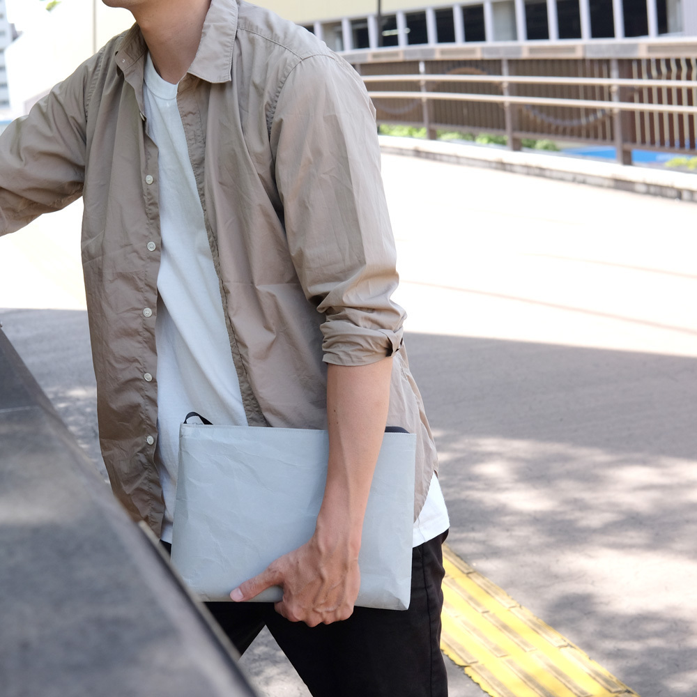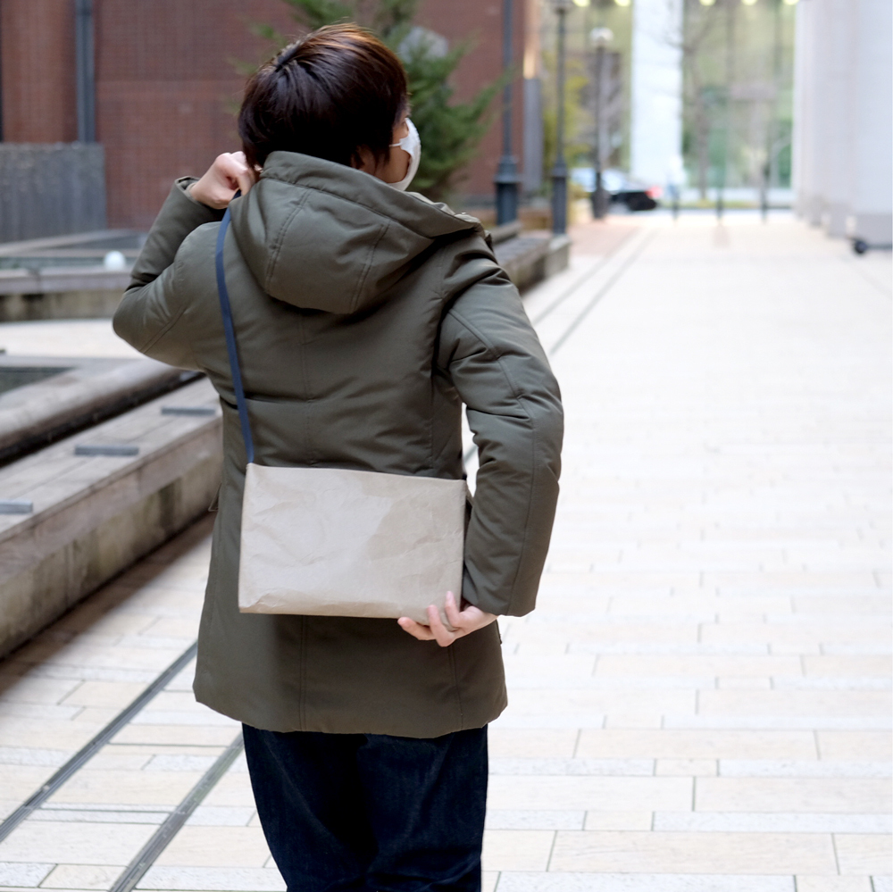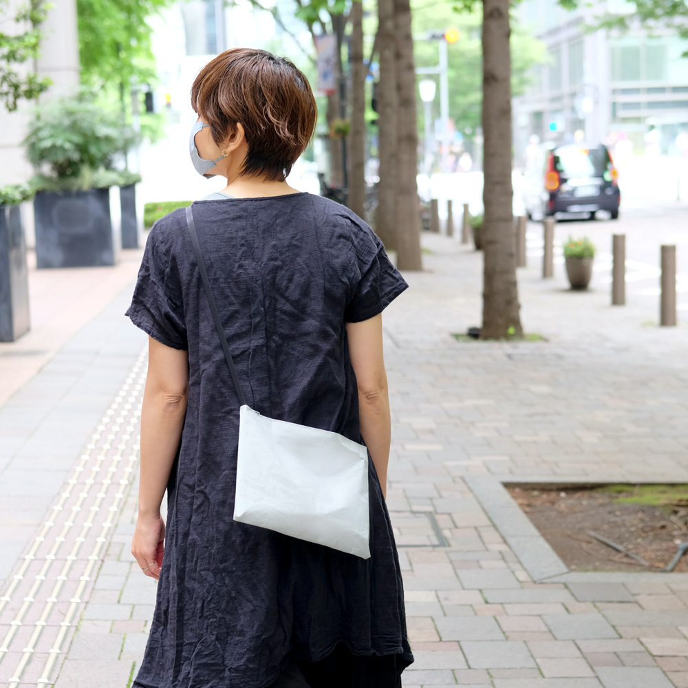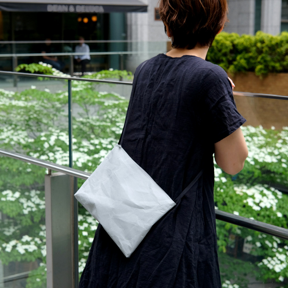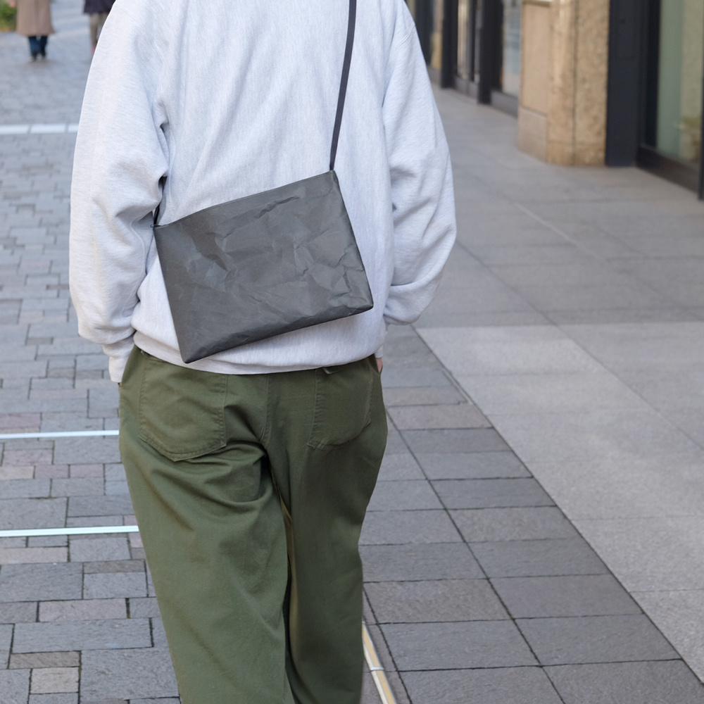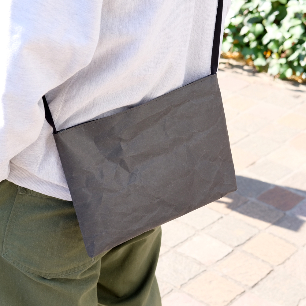 これまでアウトドアのイメージがあったサコッシュ を新しい和紙でつくりました。街歩きにも、ちょっとドレッシーな服装にも似合う、軽快なバッグになりました。最小限の荷物をコンパクトにまとめて、斜めがけバッグとして。ベルトを手首に巻きつけてポーチとしても。