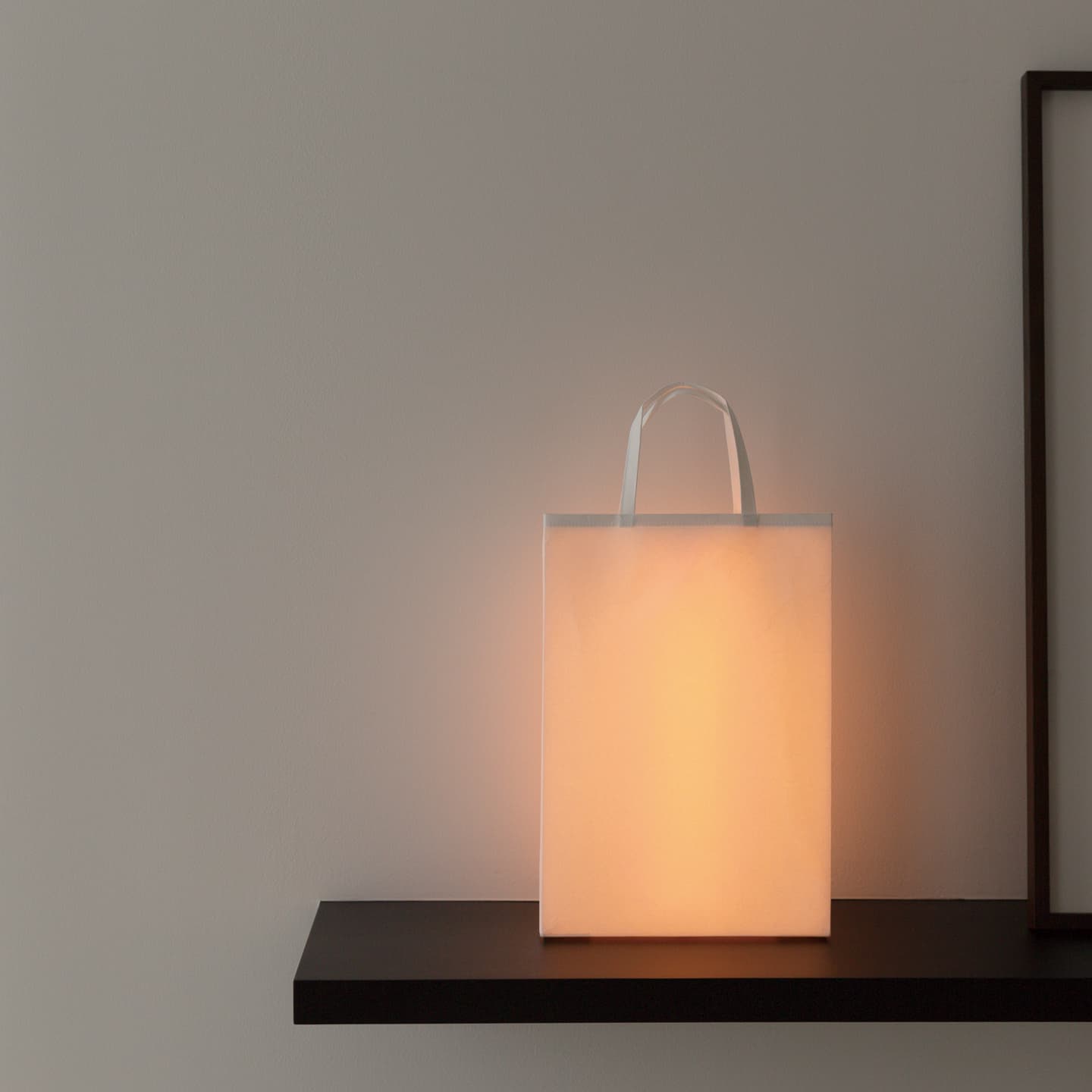 紙で包まれた光のオブジェは紙自身が素になっているということが魅力です。「光を紙で包む」がテーマです。 その包みをさらに袋に入れてお部屋の中を自由に持ち運んだり、そのままあかりを灯して使えるオリジナルバッグもデザインして付属しました。