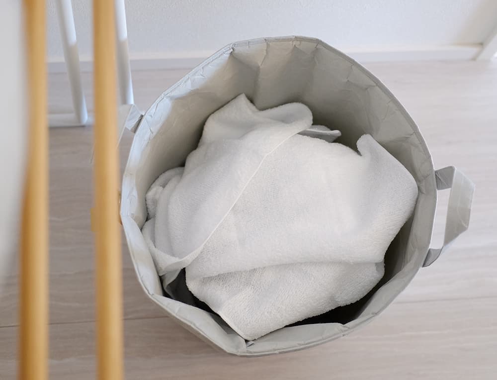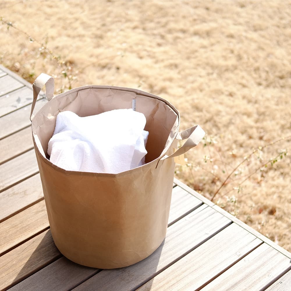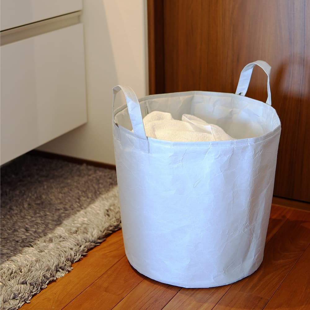 洗濯前・洗濯あとの衣類の収納と持ち運びのために。風合いの良さはそのままに、耐久性のある新しい和紙、ハードナオロンを使用しました。持ちやすいハンドルをつけて移動しやすく、プラスチック製品とは違い、洗面所やリビングに置いても目立ちづらく、やさしい姿かたちが大きな特徴です。