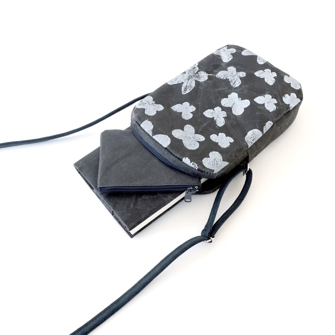 いつも手元に置いておきたいスマートフォン、リップクリームやハンカチ、カードケースやお財布をとてもコンパクトに収納できるポシェットを作りました。わずか50グラムと軽快なポシェットですが、スマートフォンの収納はもちろん、文庫本サイズの小物の収納にも対応しています。肩掛け、斜め掛けができます。