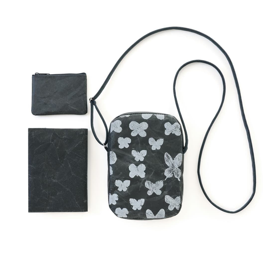 本体はソフトナオロンを使用。ほかのSIWAアイテムと同じように耐久性があり、手触りの良い和紙の風合いをお楽しみいただけます。ストラップはTORAYが開発した新素材「ウルトラスエード」を使用。優しい肌触りで耐久性があり、適度な通気性と透湿性を備えたリサイクルPET使用の素材です。73センチから140センチまで自由に長さを調節してお使いいただけるストラップです。