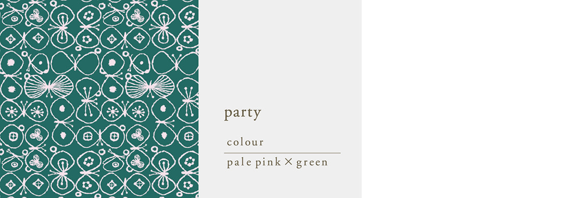 ちょうちょたちが「パーティ」に集まっている様子が描かれています。さまざまな模様の羽を広げ、楽しくにぎやかに野を持っている姿を表現したおおらかな図案です。ところどころ羽を休めたちょうちょもいます。