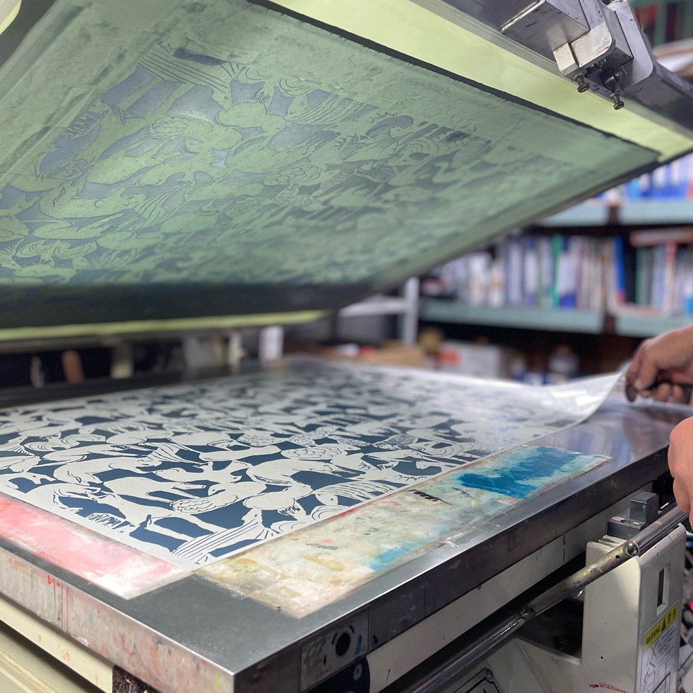 今回の企画では、素材であるナオロンとの相性も良いシルクスクリーン印刷を採用し、mina perhonenさんの繊細な柄と色を1枚1枚手刷りの印刷で表現しています。素材に馴染みやすい印刷技法を使用することで、SIWAならではの素材の経年変化ともに移ろい行く柄の変化も楽しんでいただけます。