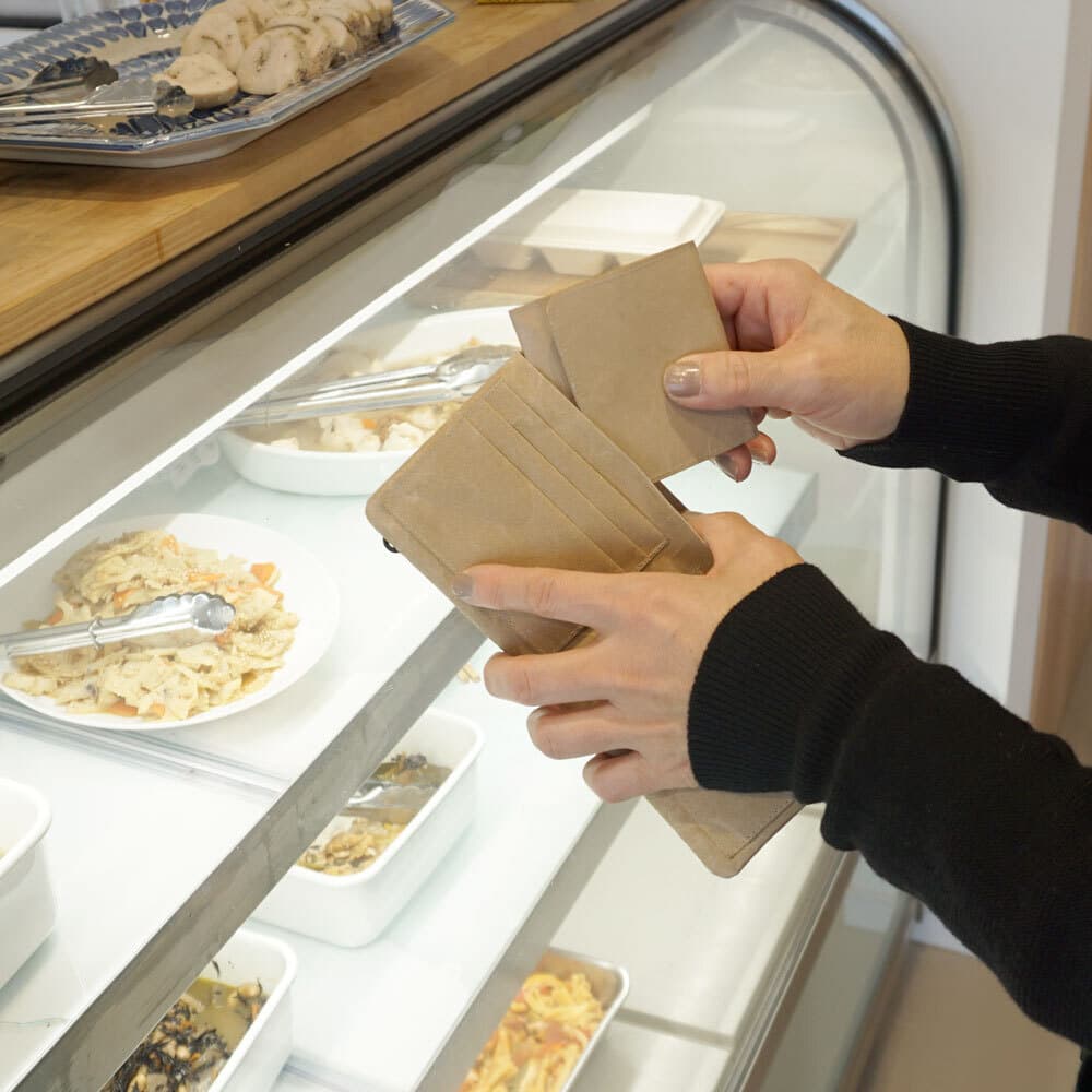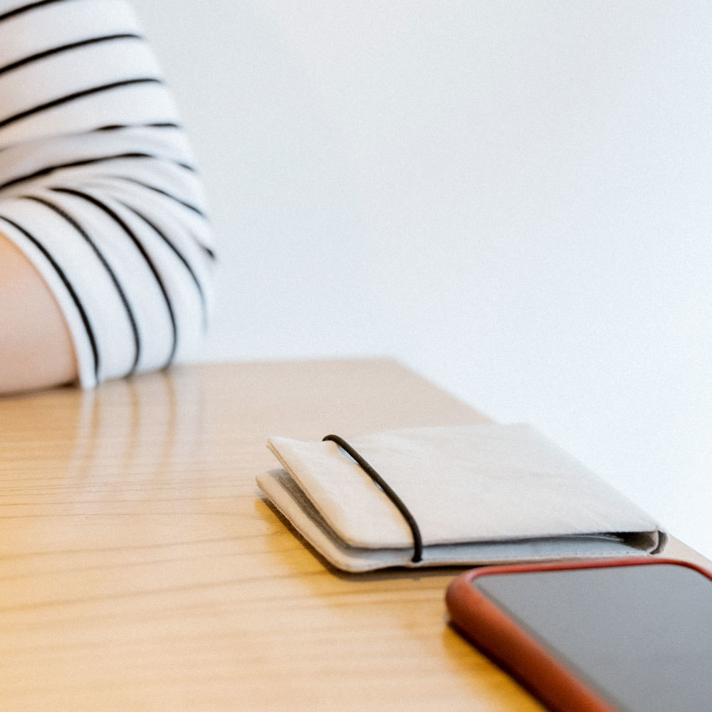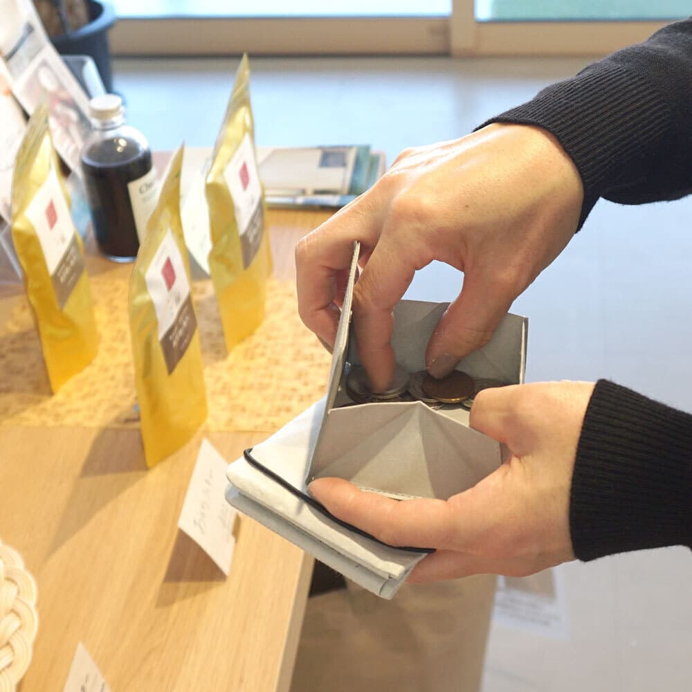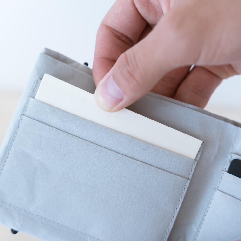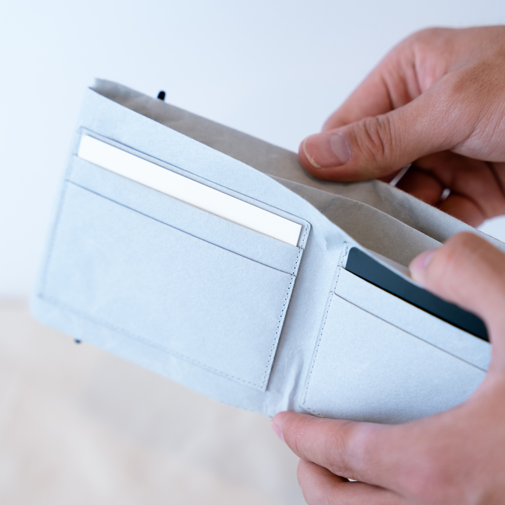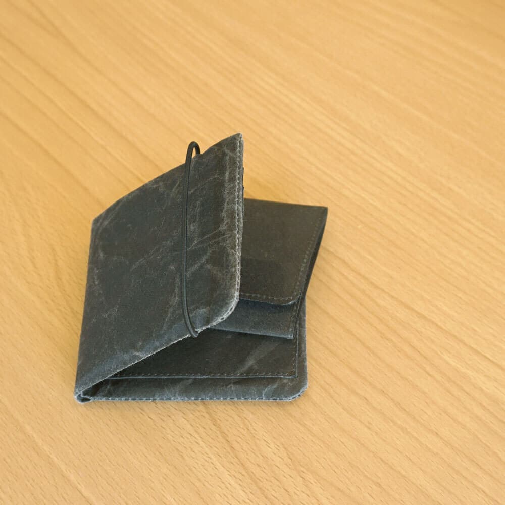 二つ折りにした後に、輪ゴムで固定。重量はわずか20グラムと、革製の財布の1/3以下の驚くほどの軽さが自慢です。