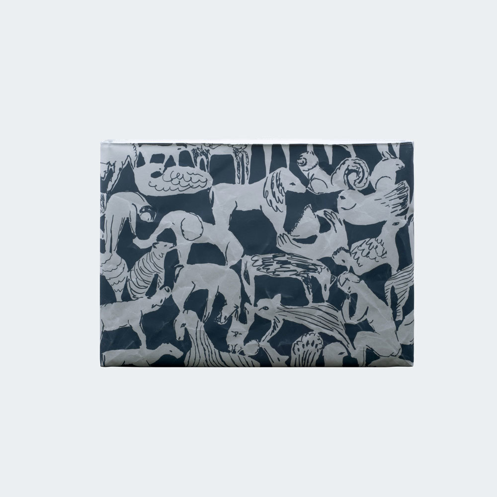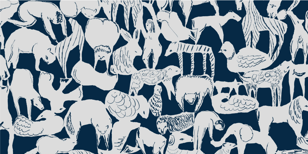 フリーハンドで描かれた様々な動物がパズルのピースのように連なった景色が描かれています。思い思いに生きているそれぞれの命が穏やかに繋がっていく世界を想像して生まれた図案です。